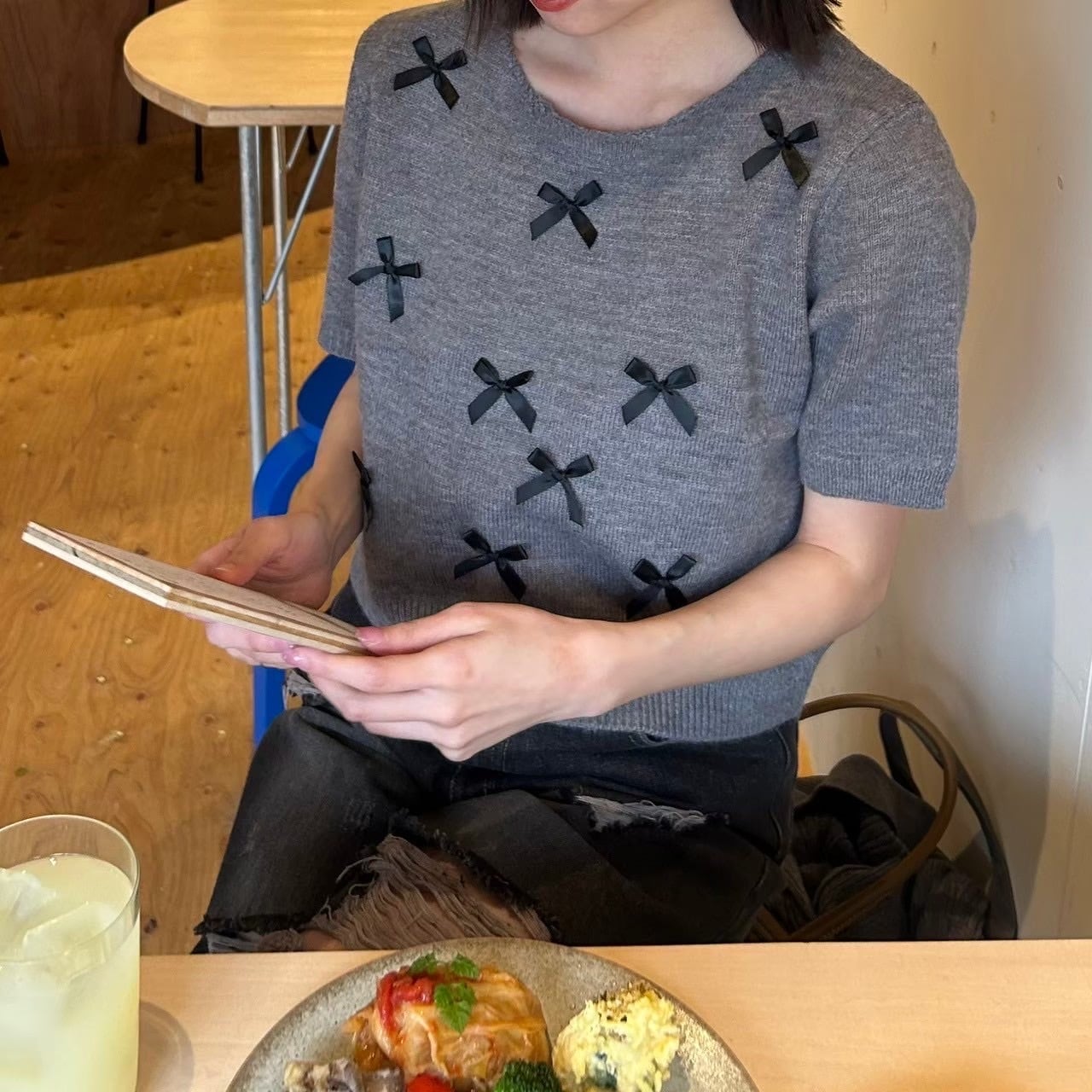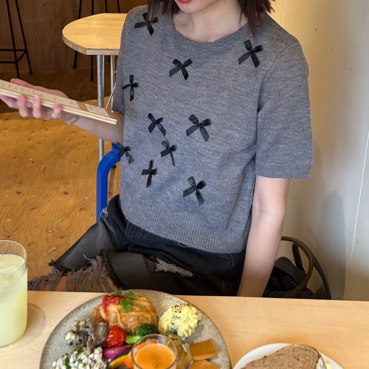 リボンモチーフ半袖ニット
