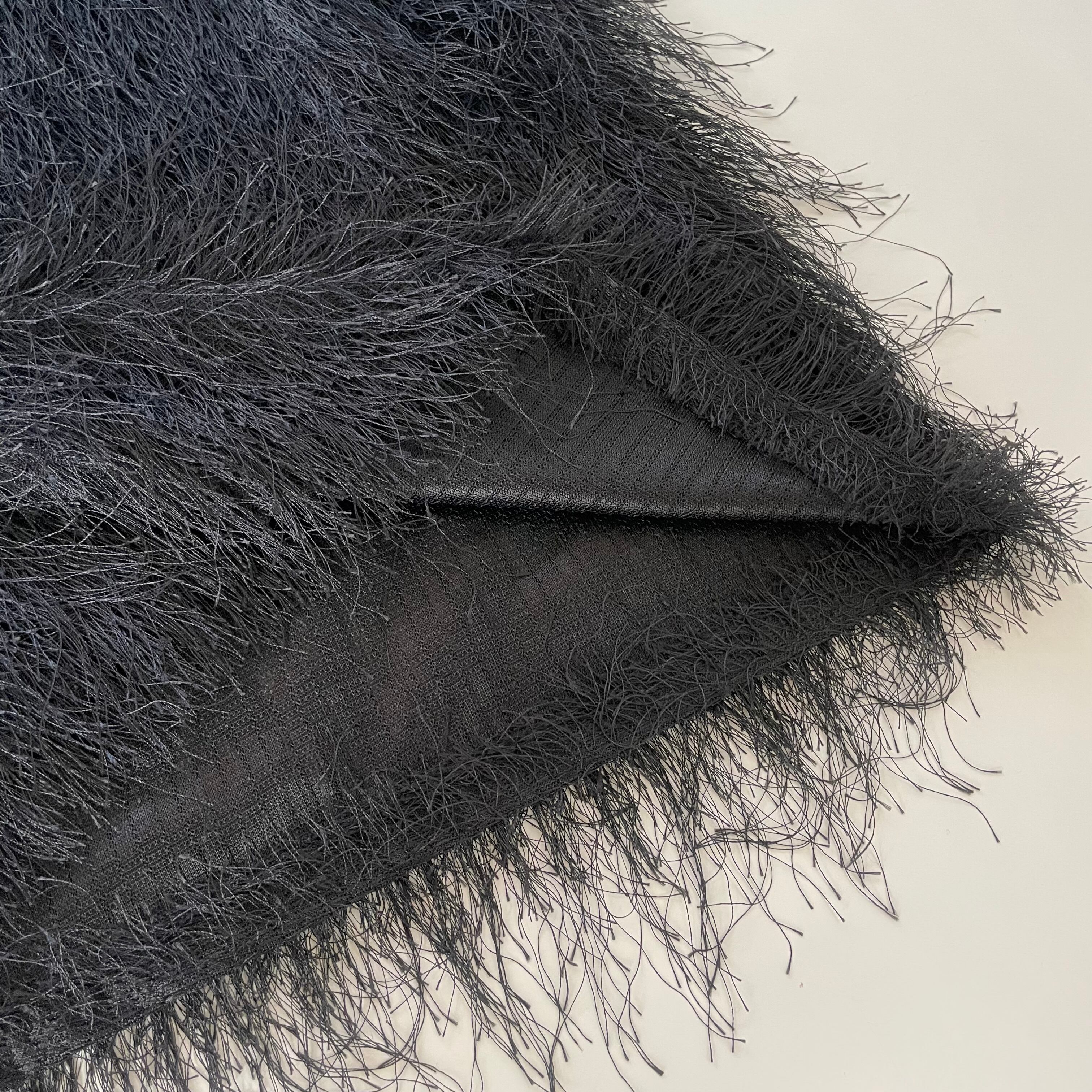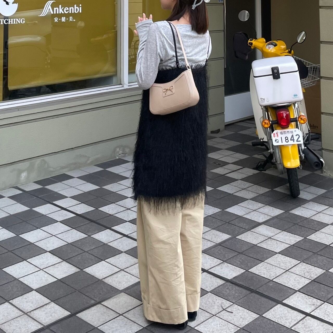 毛足が長めのフリンジを全面に施し、コーディネートを華やかにしてくれます。
